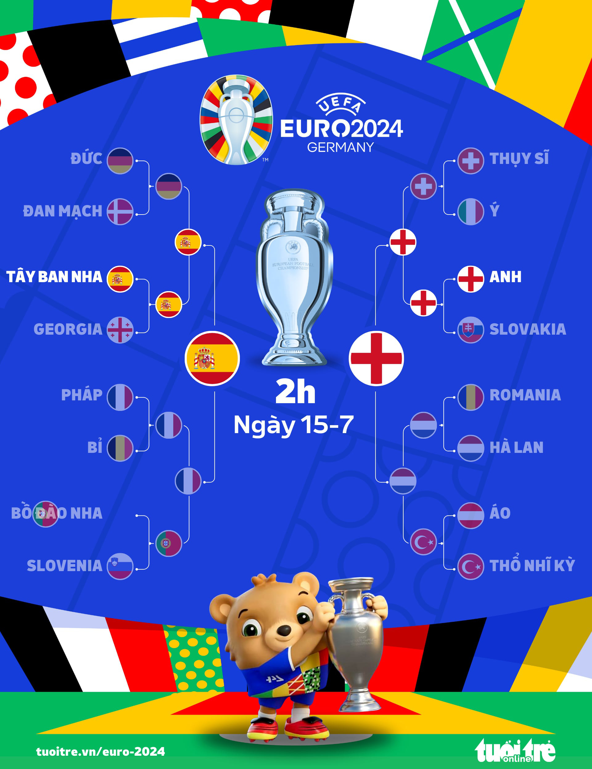 Trận chung kết Euro 2024 giữa Anh và Tây Ban Nha sẽ diễn ra lúc 2h ngày 15-7 (giờ Việt Nam) tại sân Olympiastadion ở thủ đô Berlin (Đức).